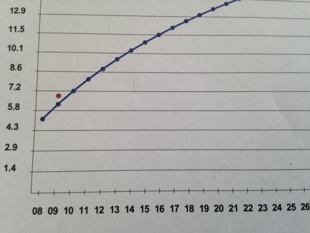 Die Rotation der Vordergliedmassen war vor unserem ersten Sprechstundentermin geschehen, also wohl noch beim Züchter entstanden. Die Rotation ist auch heute noch leicht zu sehen, aber deutlich reduziert, im Gegensatz zu der Stellung, die man hätte erwarten könnte, wenn der Welpe sich über längere Zeit unkontrolliert oberhalb seiner Wachstumskurve befunden hätte.