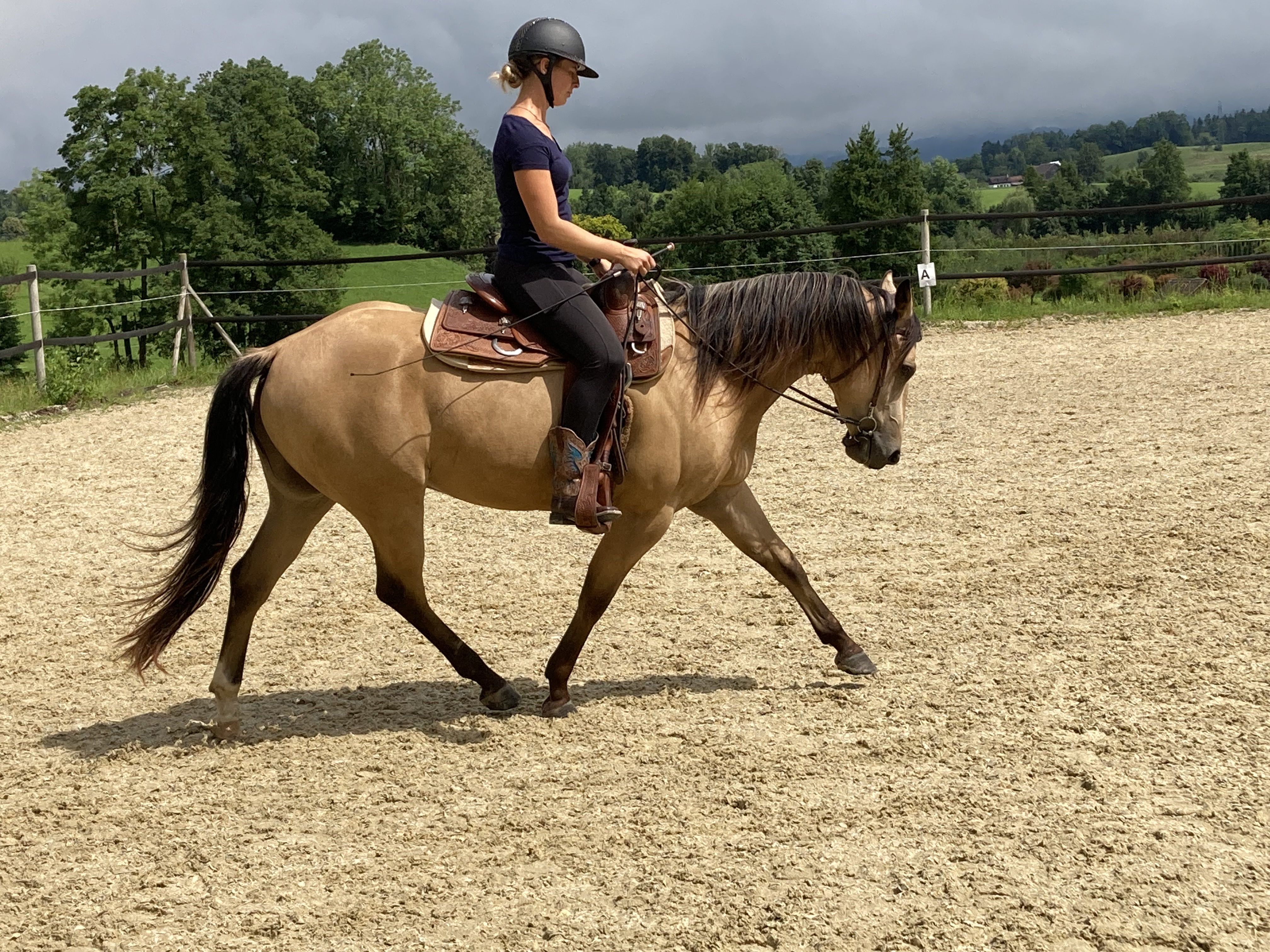 Seit 2025 ist er sicher an der Longe, geht schon brav und alleine- mit grossen Schritten- ins Gelände und macht auch, mit seinen guten Grundgangarten, eine gute Figur auf dem Reitplatz. Es gibt über ihn nichts Negatives zu berichten. Er ist einfach ein ausnehmend unkomplizierter Vertreter seiner Art.