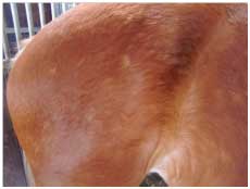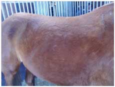 Der Hautpilzbefall ist u.a. ein Zeichen des schlechten Immunstatus. Schon nach wenigen Wochen besserte sich der Zustand des Pferdes und weiter Koliken konnten abgewendet werden.